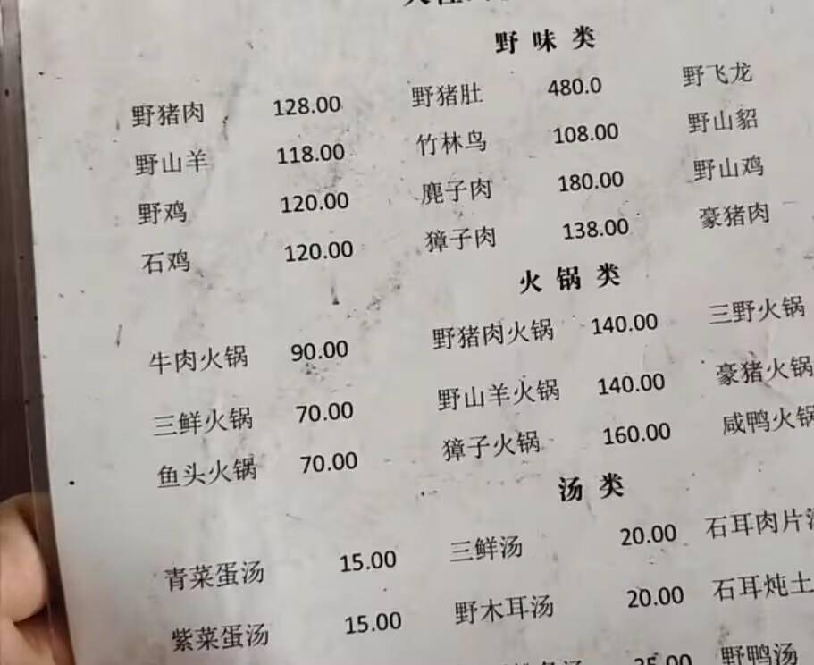 网友拍摄的视频显示,在一家饭店内,菜单上公然地写着“野猪肉”“野山羊”“野鸡”“野山貂”“野山鸡”“野飞龙”等菜,而且价格不便宜,“野猪肚”售价480元,“野山貂”售价是200元。店家把网友带到后厨时鼎冠配资,还拉开冰箱称有“五毛蛇”,“狍子”是山上“卡”的。