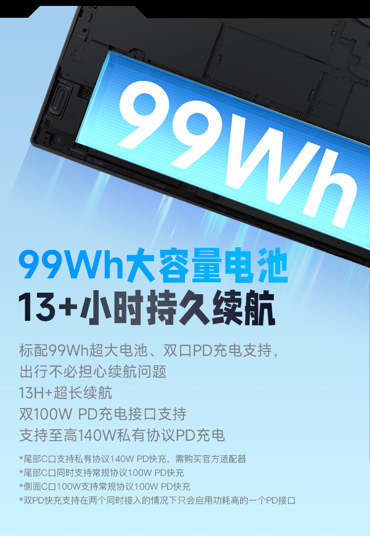 耀世 15 Pro 的另一大特色是在较小机身重量中提供了充足续航:其标配 99Wh 电池,满足 13+ 小时使用;此外其附有 210W 轻量化碳化硅电源适配器,机身的 2 个 USB-C 接口支持 100W 标准 PD(IT之家注:其中一个还支持 140W 私有协议快充)。