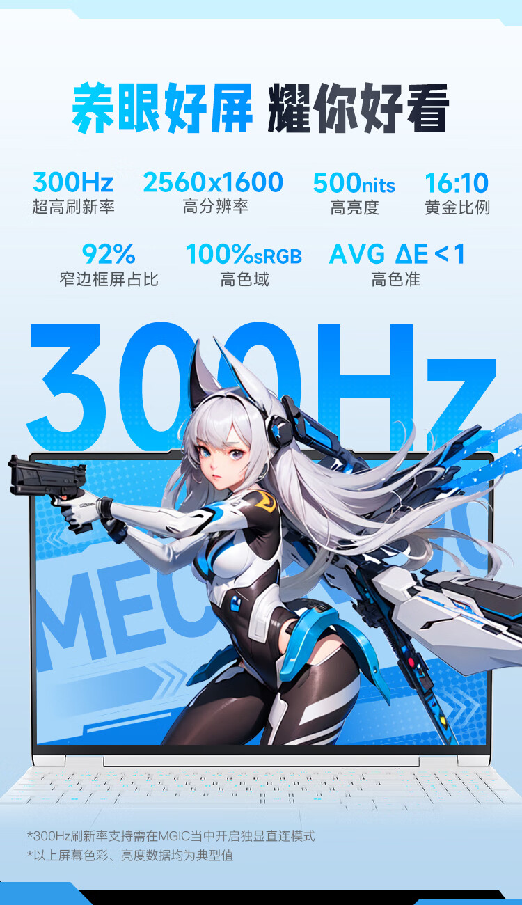 这款轻薄游戏本搭载了一块 15.3 英寸的 2560×1600 分辨率 300Hz 刷新率显示屏,具有 500 尼特亮度、100% sRGB 色域覆盖、平均 ΔE<1 色准,同时 B 面屏占比达 92%。
