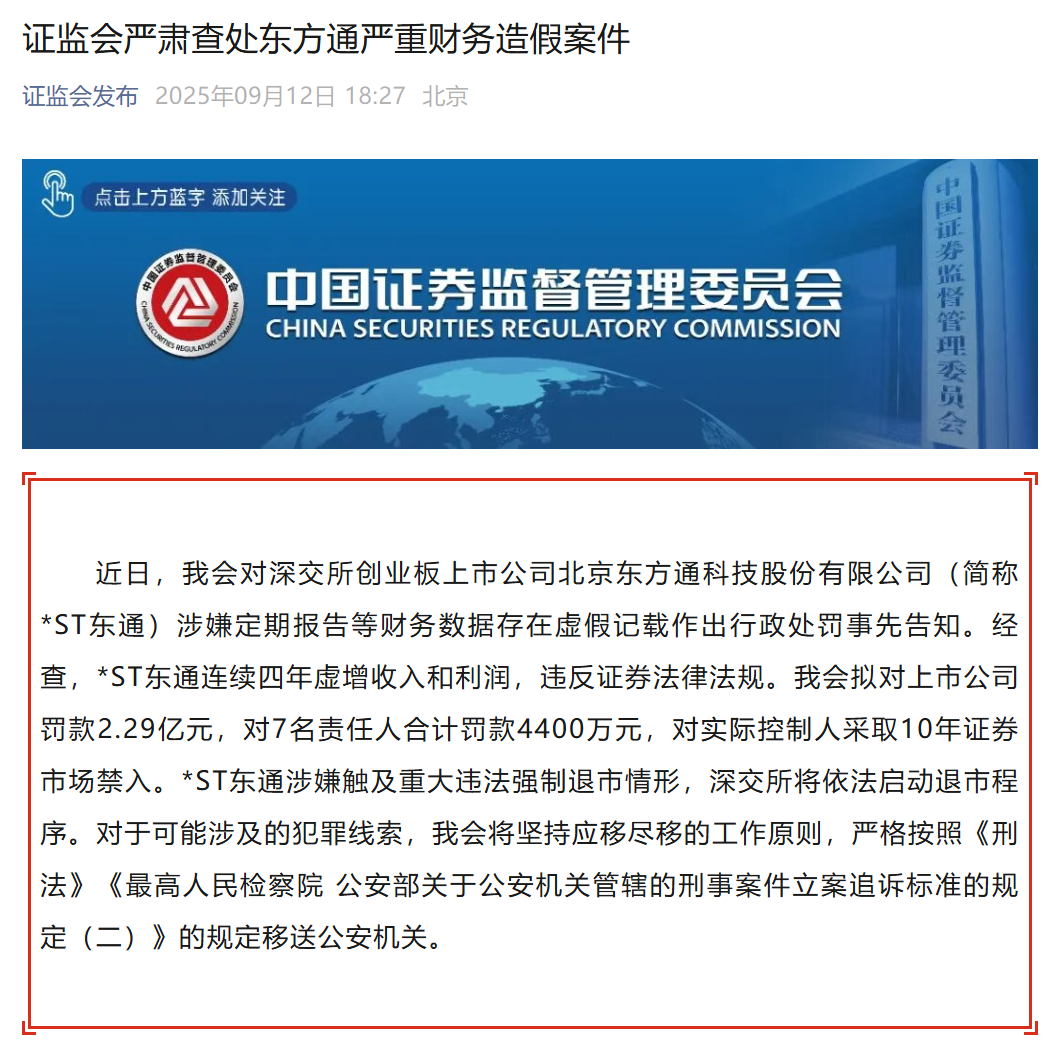 9月12日,“证监会发布”信息显示:证监会严肃查处东方通严重财务造假案件。