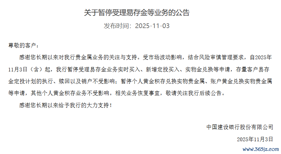 建设银行:暂停受理易存金等业务建设银行:暂停受理易存金等业务